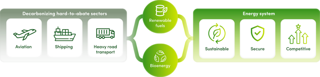 - Drive decarbonization in hard-to-abate sectors (aviation, shipping, heavy road transport)